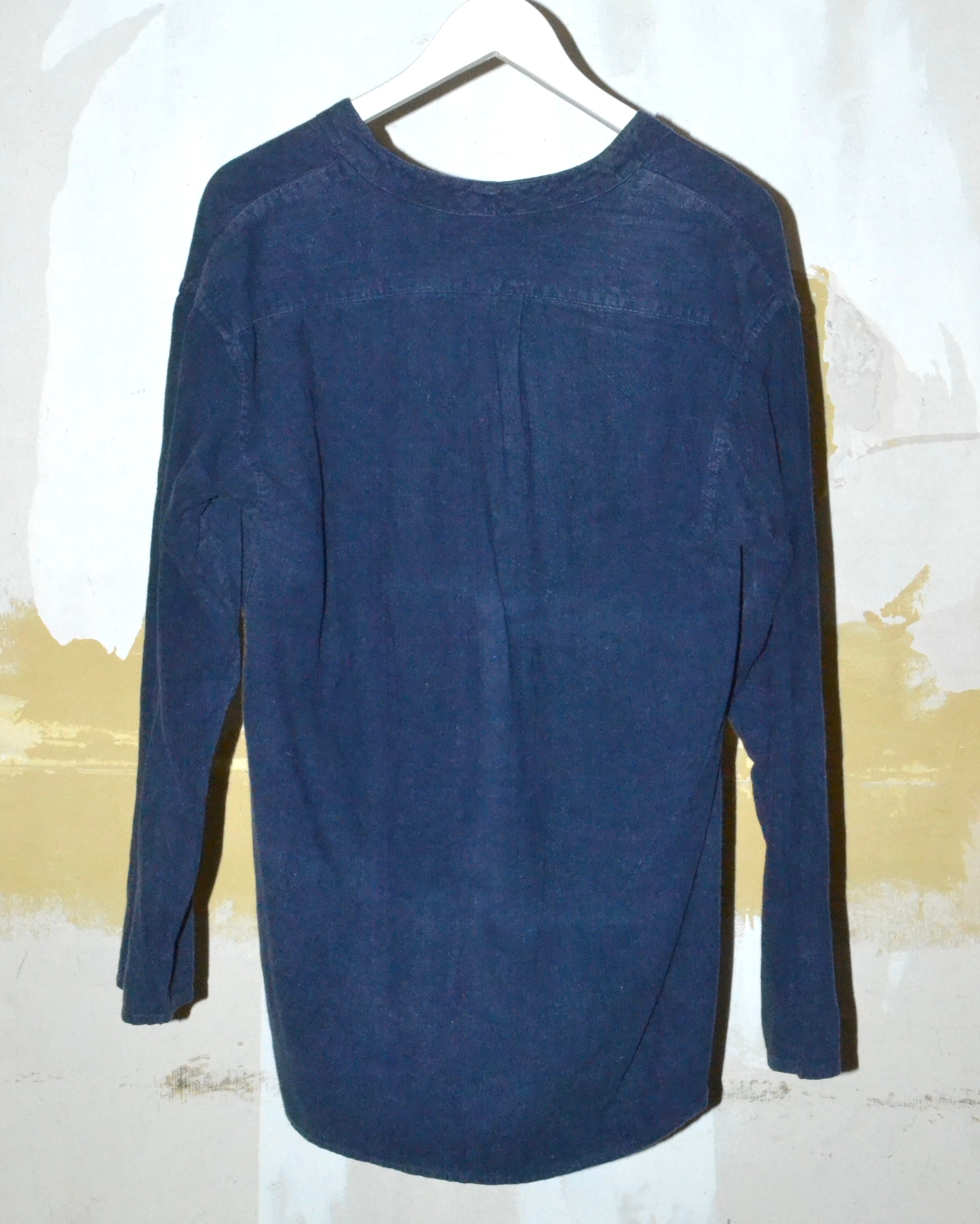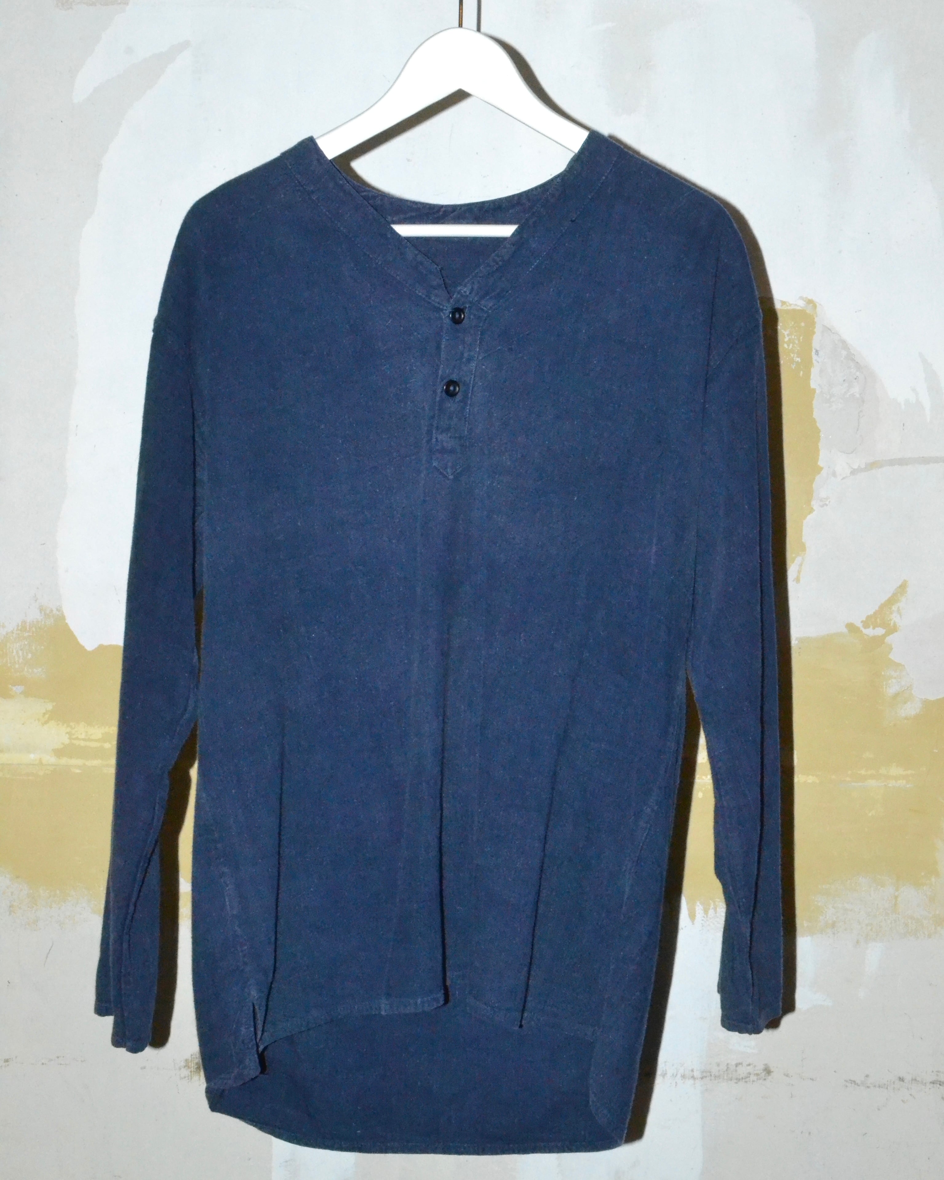 ダークネイビーまたはインディゴブルーのような濃い青系。ウォッシュ加工や顔料染めのような風合いがあり、こなれた雰囲気を醸し出しています。